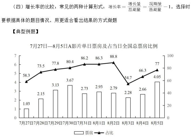增长率在考试中属于考察的难点,题型复杂多变,甚至有些题的计算量比较大,建议在做题的时候将公式和选项进行结合,尽可能去排除错误选项,从而得到正确选项。