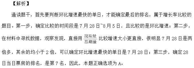 【例 4】7 月 28 日~8 月 5 日间,A 影片票房环比增速最快的单日,当日 A 影片占全国总票房的比例在该影片上映 10 天内排名: